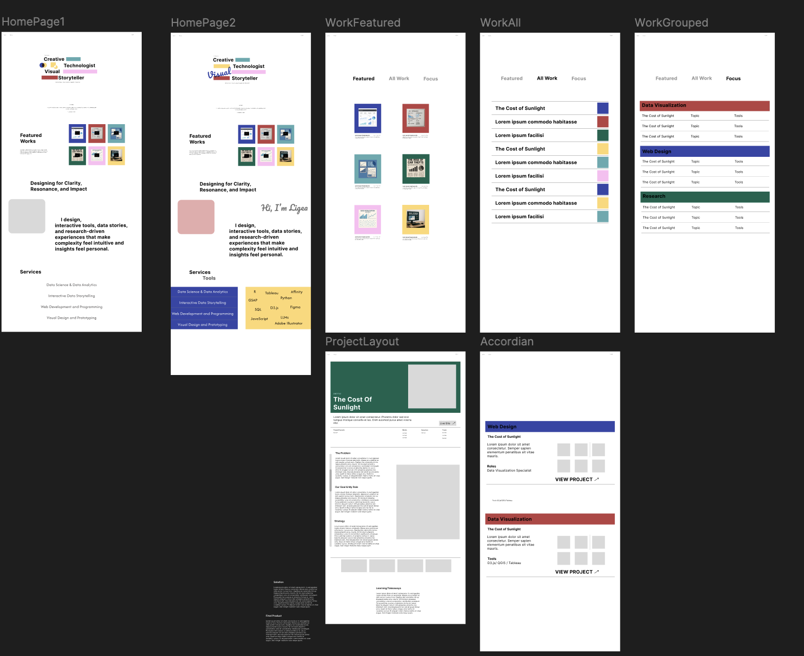 - Work Pages: planning how different project types (data, dev, storytelling) should live on the page and 'feel'.